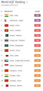 आईक्यूएयरको विश्व एक्यूआई र्याङ्किङअनुसार, दिल्लीको एक्यूआई ३ सय ९ पुगेको छ भने काठमाडौँको एक्यूआई २ सय ५० रहेको छ। बेइजिङको एक्यूआई १ सय ६१ रहेको छ। यसअघि, काठमाडौँ पहिलो स्थानमा रहेको थियो, तर अब दिल्लीले उछिनेको छ। यद्यपि, काठमाडौँको २ सय ५० एक्यूआई अझै पनि ‘अति अस्वस्थ’ को श्रेणीमा पर्छ। विश्व स्वास्थ्य संगठन (डब्ल्यूएचओ) का अनुसार, एक्यूआई ३५ भन्दा कम हुनुपर्नेमा ५० सम्मको स्तर सामान्य मानिन्छ। तर, २ सय १ देखि ३ सय सम्मको एक्यूआई ‘अति अस्वस्थ’ र ३ सय १ देखि ४ सय सम्मको एक्यूआईलाई ‘खतरनाक’ मानिन्छ।
